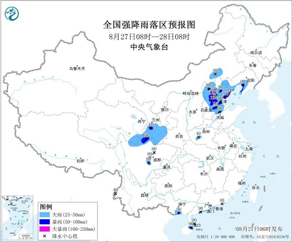 據(jù)中央氣象臺(tái)消息,8月27日08時(shí)至28日08時(shí),內(nèi)蒙古東南部、遼寧西南部、河北大部、北京、天津、山東北部、青海南部、甘肅中南部、川西高原北部、四川盆地西部和南部以及廣西南部沿海、廣東南部沿海、海南島等地部分地區(qū)有大到暴雨,其中,河北中部和東北部、北京西南部等地局地有大暴雨(100~130毫米),上述部分地區(qū)伴有短時(shí)強(qiáng)降水(最大小時(shí)降雨量20~50毫米,局地可超過(guò)70毫米),局地有雷暴大風(fēng)等強(qiáng)對(duì)流天氣。