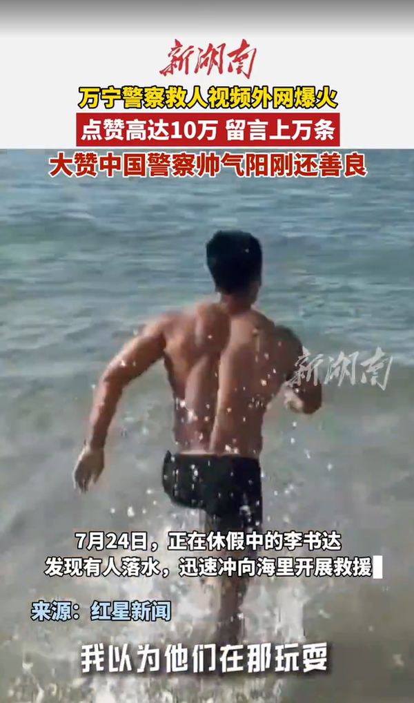 近日,一段中國警察休假勇救落水者的視頻在國外社交平臺爆火!視頻中,海南省萬寧市公安局民警李書達(dá)在海邊休假時,發(fā)現(xiàn)有人落水,毫不猶豫地沖向大海施救。這英勇一幕被拍下后,瞬間在國外引發(fā)熱議,點(diǎn)贊量逼近10萬,留言上萬條。外國網(wǎng)友紛紛留言:“他簡直是超級英雄!”“中國警察真是帥氣又善良!”