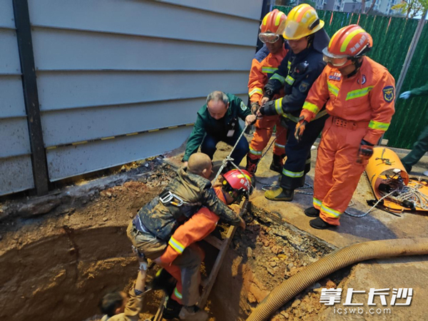 消防救援人員迅速在坑口固定金屬爬梯。一名救援人員系好安全繩、扣緊腰帶,沿梯下至積水區(qū)域,為工人固定好安全腰帶,將其穩(wěn)妥背在背上,上方隊(duì)員則拉緊安全繩全程保護(hù)。下午5時(shí)51分,經(jīng)過14分鐘的緊張施救,傷者被成功救出,并移交現(xiàn)場120醫(yī)護(hù)人員送往醫(yī)院進(jìn)一步救治。