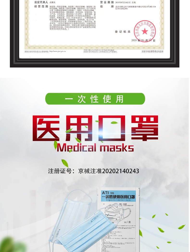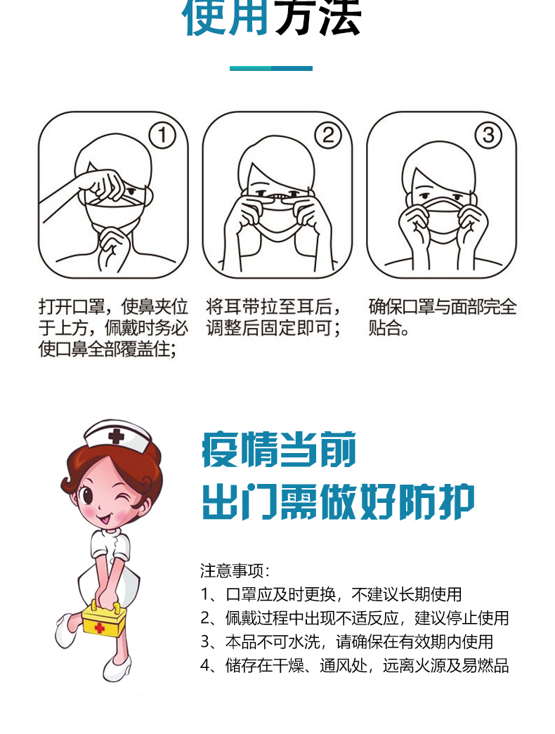 【適用范圍】一次性使用醫(yī)用口罩適用于佩戴者不存在體液和噴濺風(fēng)險的普通醫(yī)療環(huán)境下的衛(wèi)生護理。