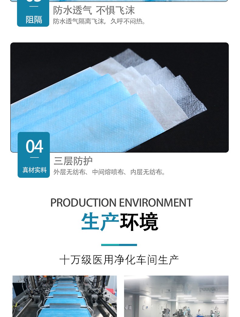 【結(jié)構(gòu)組成】一次性使用醫(yī)用口罩由口罩體、鼻夾和口罩帶組成,口罩體由無紡布和熔噴布制成。一次性使用醫(yī)用口罩在10萬級潔凈間生產(chǎn),未經(jīng)消毒處理微生物指標符合技術(shù)要求。